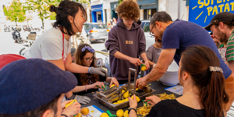 L'idée au fondement de Super Patate, c'est que tout le monde aime les frites, peu importe ses origines géographiques et sociales, sa religion, son régime alimentaire, etc. Alors pourquoi ne pas se retrouver autour d'un cornet de frites? On amène 30kg de patates, des économes, une friteuse, et c'est parti pour les frites gratuites!